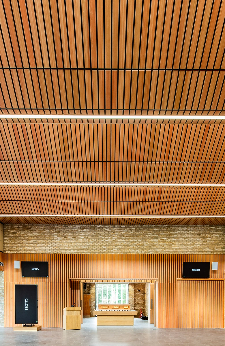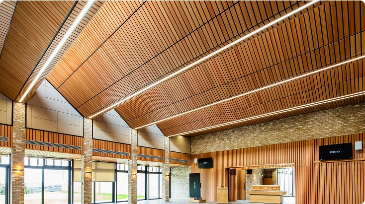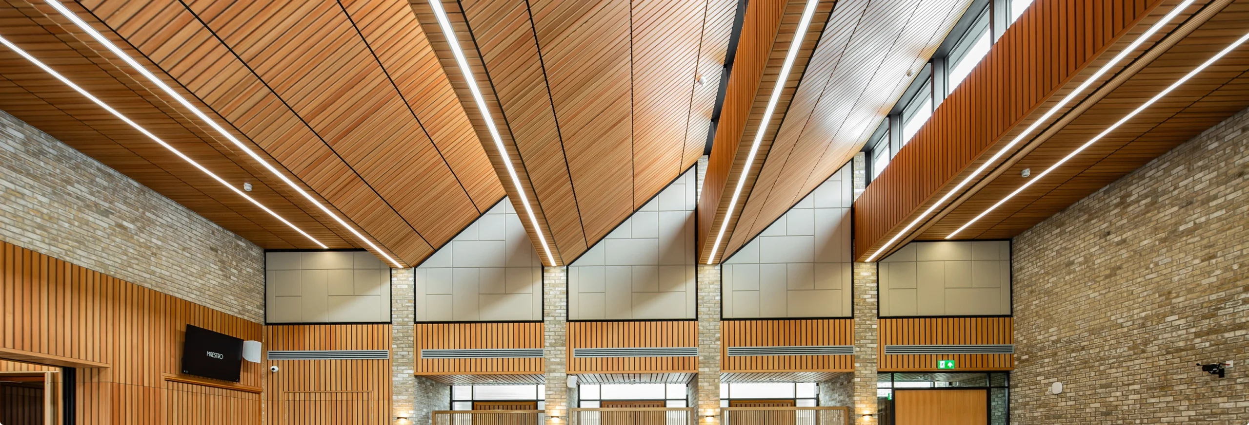 Bring natural wood into your design without compromising acoustic comfort. Our veneered wall and ceiling panels offer sound absorption through precision-cut perforations and blade configurations, all tested for verified performance.