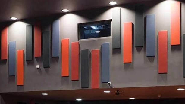 Prefabricated fabric-wrapped acoustic wall and ceiling panels custom designed to reduce interior noise reverberation.