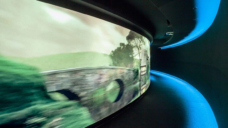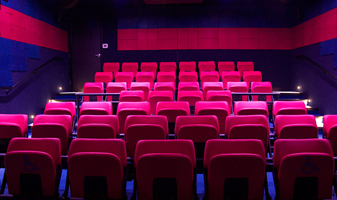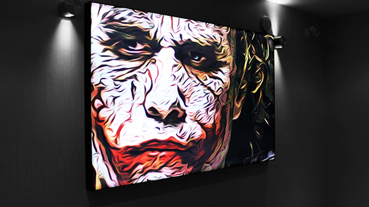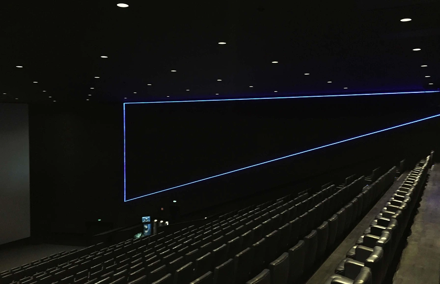 Before and after the feature presentations, energy-efficient ultra-bright LED lights illuminate the image, and create an eye-catching presentation to complement the onscreen pre-show and the cinema environment. When the movie starts, the LED lights dim, and the unique patented construction allows images to completely disappear and retreat from audience's line of sight.