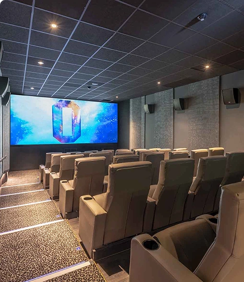 All the products and services we offer for commercial cinemas, are also available for those who would like to bring cinema home. From the most complex designs to the simplest and smallest spaces, the limit is only in your imagination. Our in-house Technical Team and experienced Installation Crew can turn any interior space into a complete home cinema, or a media room with excellent aesthetic and acoustic solutions. We treat your space no different than an actual movie theatre, so you can enjoy the real cinema experience in the comfort of your home.